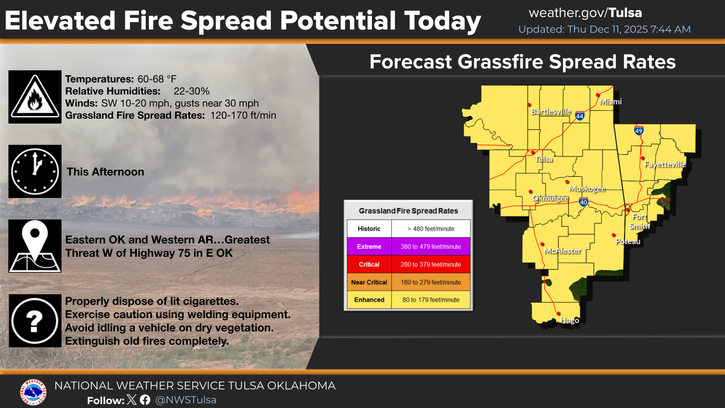 The National Weather Service in Tulsa says the conditions will potentially lead to rapid grassfire spread during the afternoon hours Thursday. The higher risk for fires is west of Highway 75.