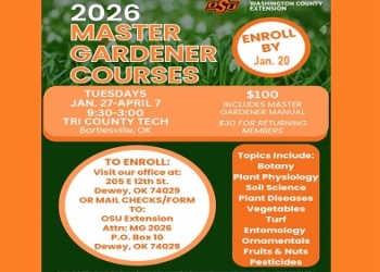 Enrollment for the 2026 Washington County Master Gardener classes has been extended to January 20, 2026.  Contact the Dewey Extension office at 918-534-2216 to ask questions, enroll or complete and return the enrollment form.  See attachments for more information.