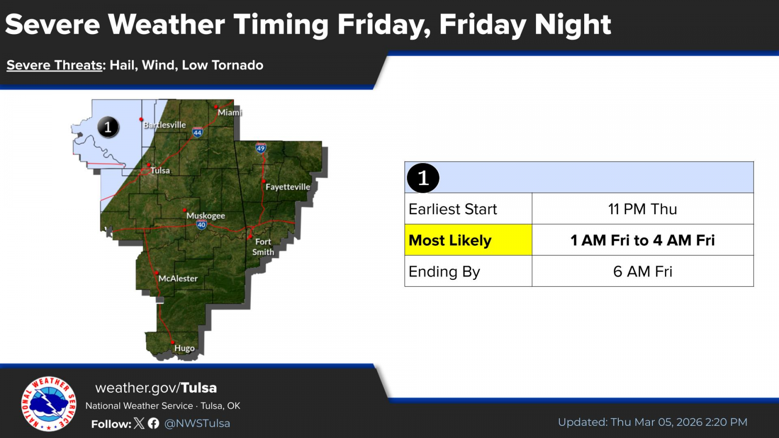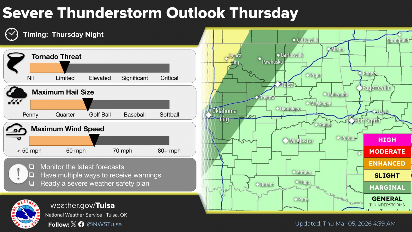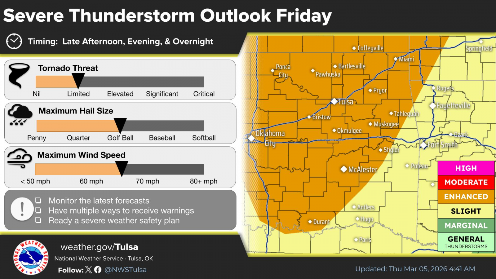 The severe risk during the overnight hours is a Level 1 of 5 from Ramona to the south and east, and a Level 2 from Bartlesville to the north and west. The severe risk increases to a Level 3 for far western Osage and Chautauqua counties.