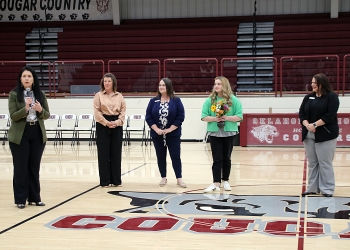 Oklahoma Secretary of Agriculture, Food, and Forestry Blayne Arthur and Ag in the Classroom Program Coordinators Emily Ague, Melody Blosser and Annie Davis presented Oklahoma Union Middle School STEM and Sixth Grade Science Teacher Jacey Duncan with the National Excellence In Teaching About Agriculture, Tuesday, March 3, during a Middle School and High School assembly.