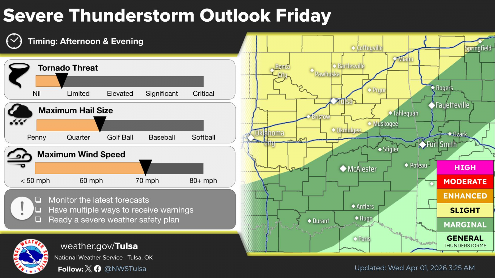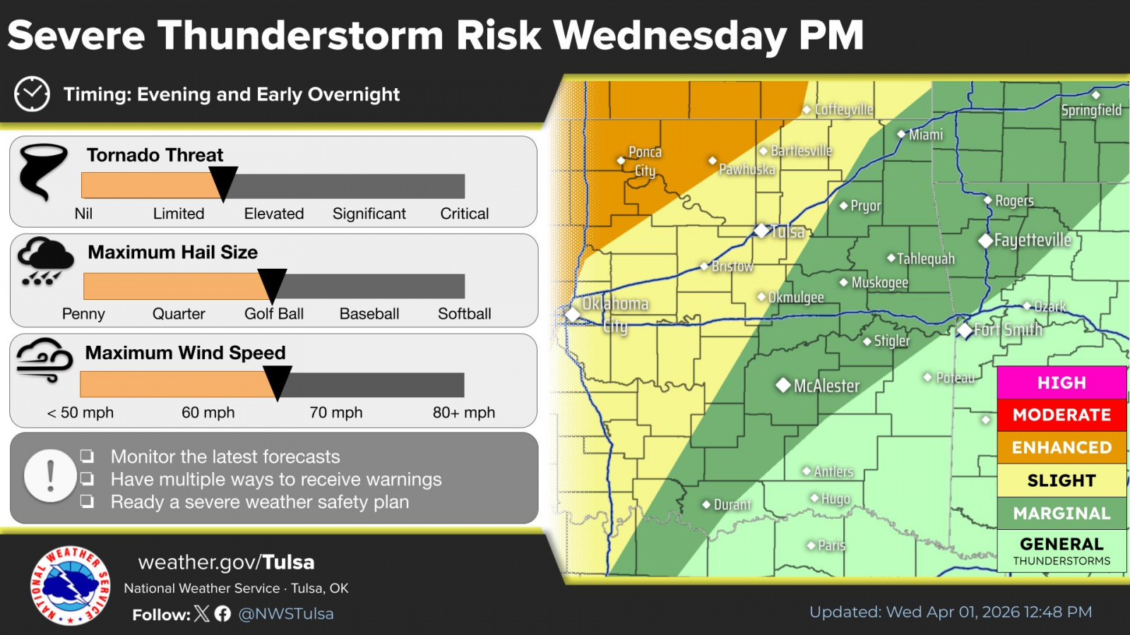 Then, a line of strong to severe thunderstorms are expected to move into eastern Oklahoma Wednesday evening. Damaging wind gusts will be the primary hazard, along with a low potential for quick spin-up tornadoes and possibly some large hail.