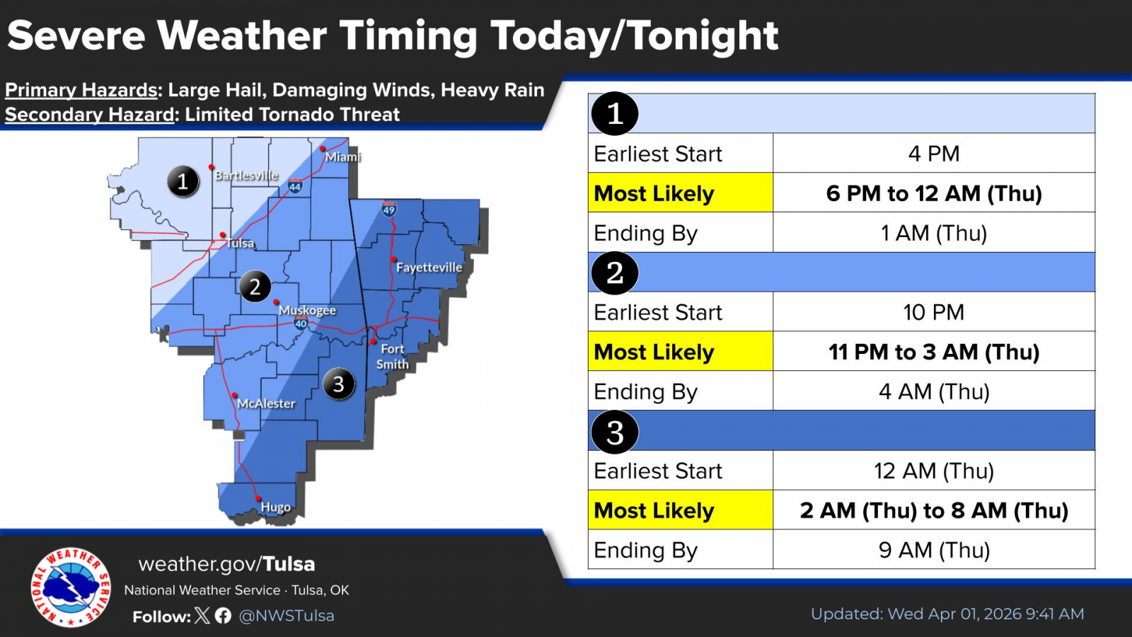The most likely timing for severe weather is 5 p.m. Wednesday to 1 a.m. Thursday.