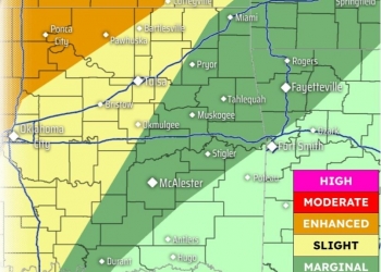 A Level 3 out of 5 risk exists for the northern half of Osage County, northern quarter of Washington County. All of Chautauqua County and most of Montgomery County are included in the risk area. A Level 2 risk exists from Bartlesville to the south and east.