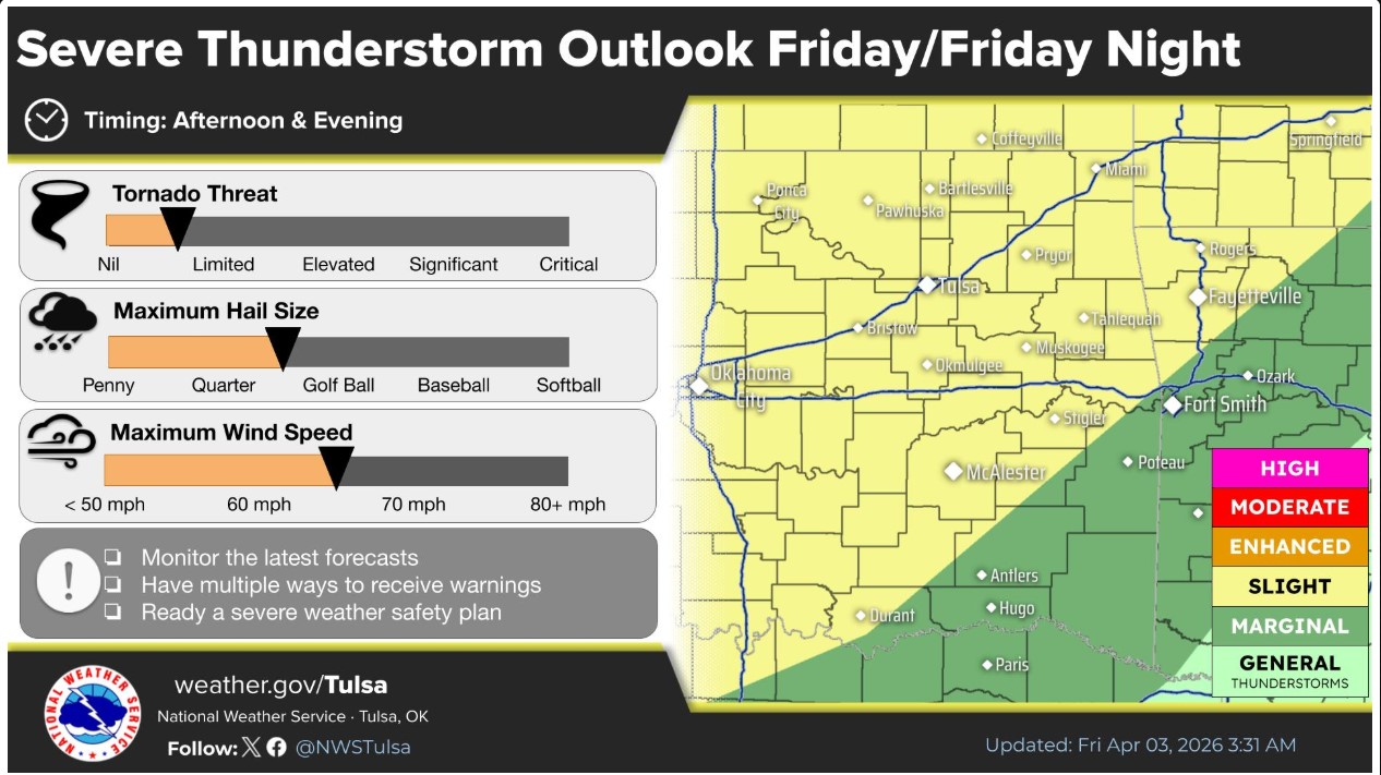 Severe weather is possible Friday evening with moderate levels of wind gusts, hail and flooding, especially in areas that saw heavy rain Wednesday evening.