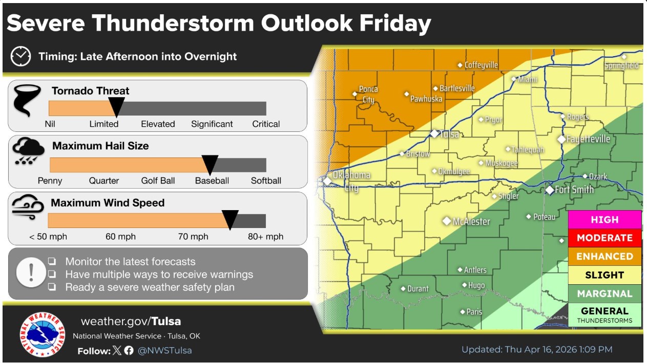 There is a possibility for severe weather Friday afternoon into the evening hours near the Oklahoma-Kansas state line. Storms are expected to populate the area at approximately 4 p.m. Friday.