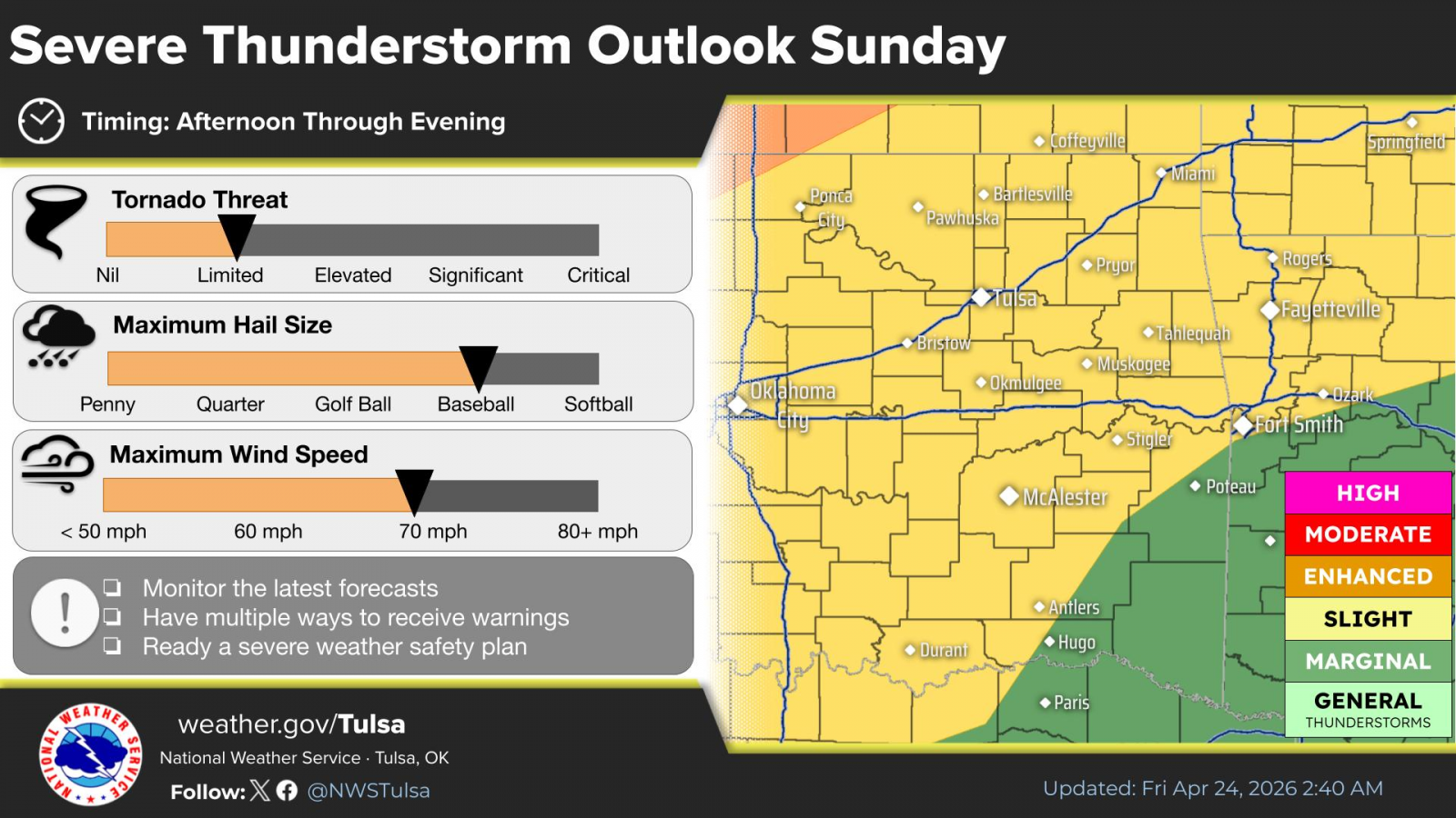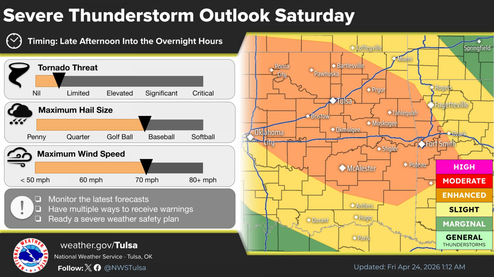 A Level 3 of 5 severe risk zone is expected across the listening area Saturday afternoon and evening, with a Level 2 of 5 zone in Montgomery County, Kan. Large hail and damaging winds are the primary severe threats.