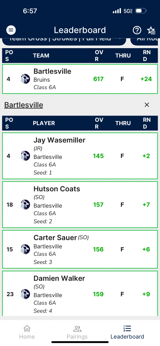 BHS is peaking at the right time, as Bartlesville got great performances from junior Jay Wasemiller and sophomore Carter Sauer. Wasemiller finished fourth individually with a two-round score of 145 and two over par. Sauer finished at 156.